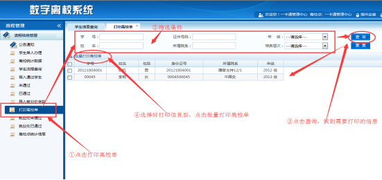 ③点击查询,选择要打印的信息,点击批量打印离校单