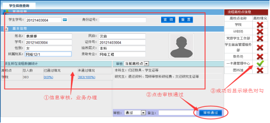2.各单位在毕业生成功办理手续后,在系统中点击审核“通过”。