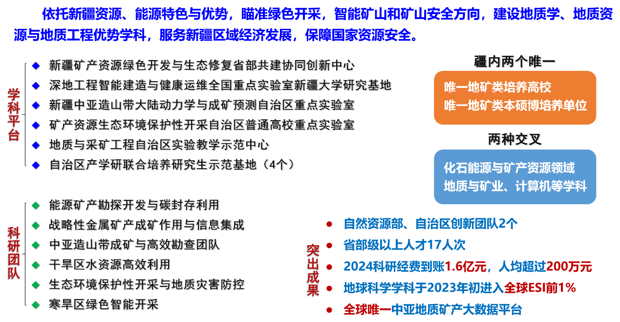 依托新疆资源、能源特色与优势,瞄准绿色开采、智能矿山和矿山安全方向,通过化石能源与矿产资源领域交叉以及地质、矿业智能制造、信息工程、计算机技术与化学化工等学科交叉,充分发挥地质学、地质资源与地质工程优势学科,积极开展科学研究与团队建设。